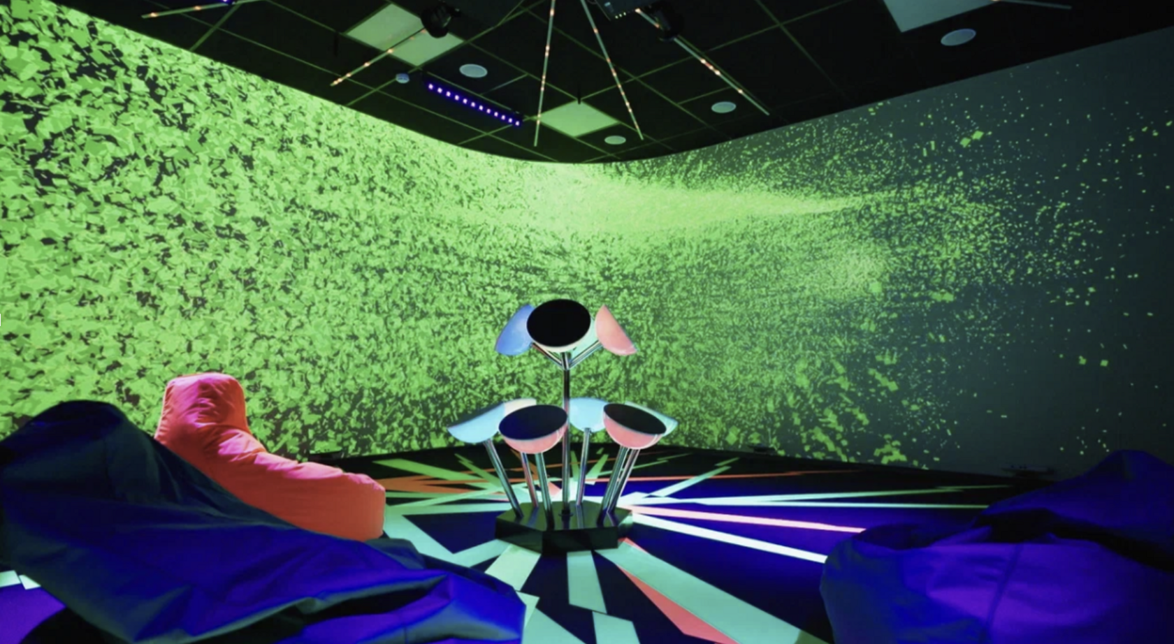 The main object of the room is a large screen with unusual proportions - it is ultra-wide. The image on it is formed by two powerful projectors, the picture of which must be perfectly stitched together so that there are no gaps or overlaps. This creates the effect of infinite space. Plus surround sound system, built so that it is felt evenly in any point of the room (this was achieved thanks to the ceiling placement of loudspeakers). Sounds here are transformed into images, and human movements, especially with hands - into sounds. For example, if a visitor sings or plays a musical instrument, the color on the screen changes, hand movements generate music, and simple drawings on a tablet are transformed on the screen into almost artistic canvases. Another element of the system is “drums”, playing on which you can get a variety of sounds to which the color design of the screen responds.